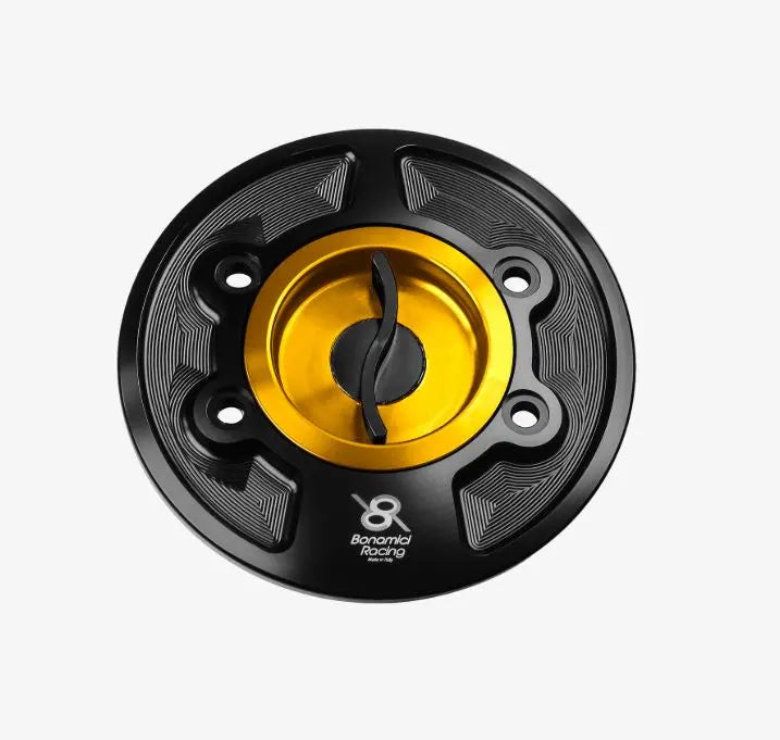 Bonamici BMW Gas Cap. Keyless for a Quick Release to make Gas Fill Ups Easy especially for Racers and Performance Street Riders. Up to 50% Lighter than OEM gas caps, made from CNC Aluminum T-6061. Anodized in Black. Includes Rubber Seal O-Ring and Stainless Steel Screws (may require use of OEM screws).