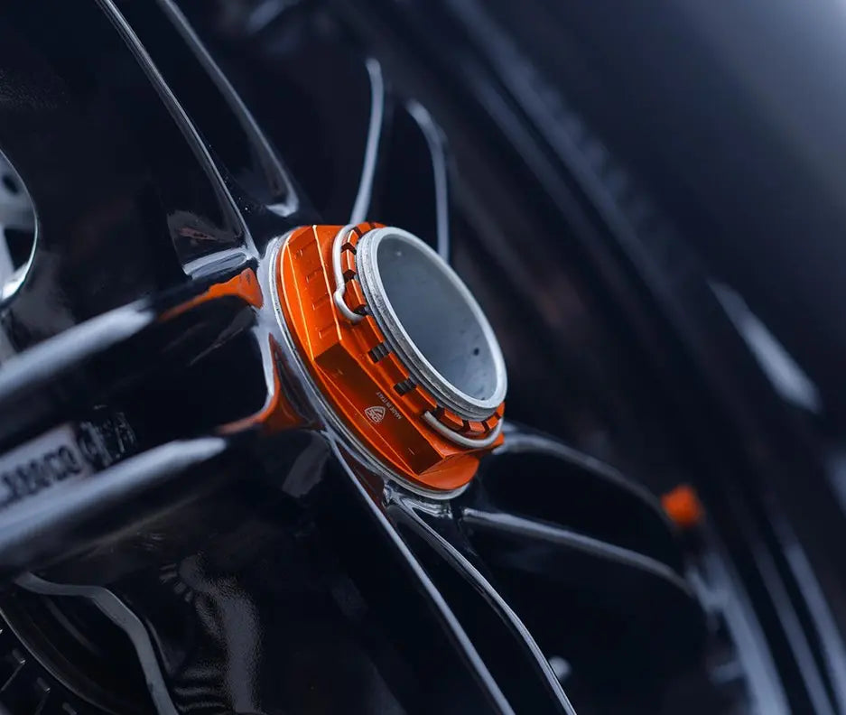 Rear wheel nut (right side) made from lightweight alloy, machined from a solid piece, and anodized for durability.